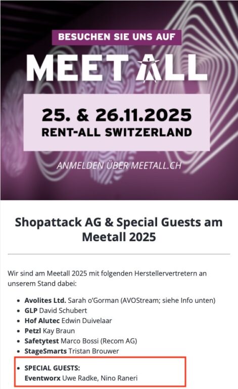 Wir freuen uns, bekanntzugeben, dass Eventworx in diesem Jahr erstmals auf der Meet-All 2025 vertreten sein wird – der Hausmesse und dem zentralen Treffpunkt für die Produktions- und Live-Branche von Rent-All Schweiz.