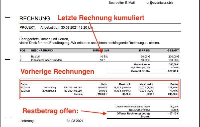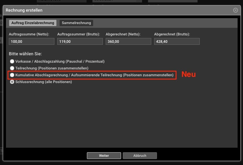 Das Erstellen von Teilrechnungen war ja schon möglich. Nun sind auch kumulierte Teilrechnungen möglich. Für alle, die Teile von Aufträgen kumuliert abrechnen müßen, geht das nun.