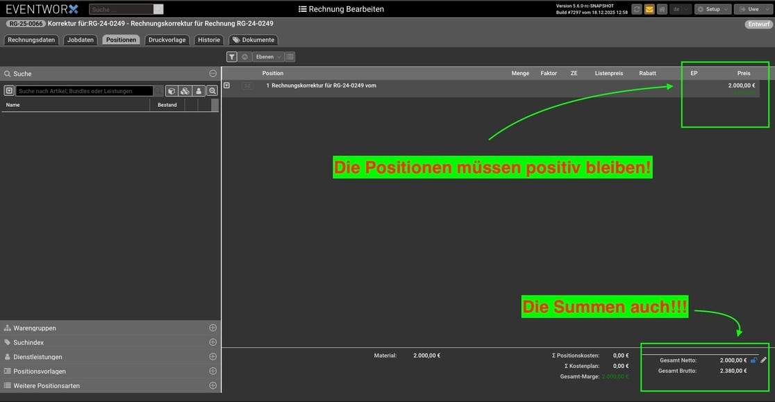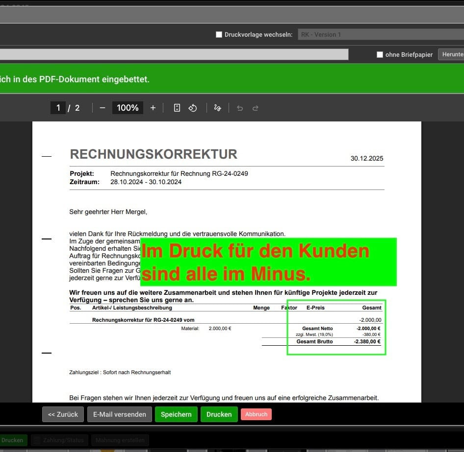 - Rechungskorrektur: Korrekte negative Darstellung von Positionssummen und Mengen bei Rechnungskorrekturen im PDF