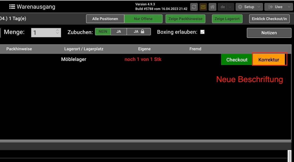 Wegen der Schwierigkeiten, die Funktion “Buchungskorrektur” zu finden und stattdessen den Artikel erneut einzuchecken, haben wir beschlossen, die Bearbeiten-Grafik durch die Beschriftung “Korrektur” zu ersetzen.