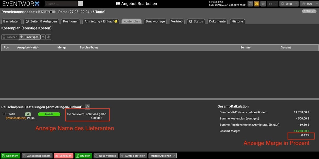 Kostenplan: Anzeige Lieferant und Marge in Prozent