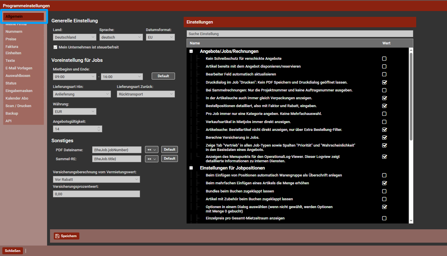 Hier legst du die Standardwerte für neue Jobs an. Von Mietzeiten, Lieferart über deine Währung bis hin zur Angebotsgültigkeit.