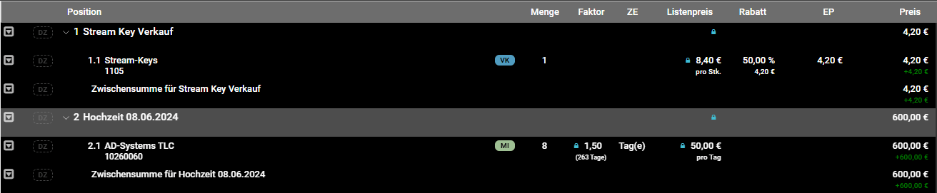 In diesem Beispiel waren zum Beispiel 1. Stream Key Verkauf und 2. Hochzeit 08.06.2024, 2 verschieden Jobs. Aber hier wurde der Jobtitel des jeweiligen Job als Posititionsname genommen