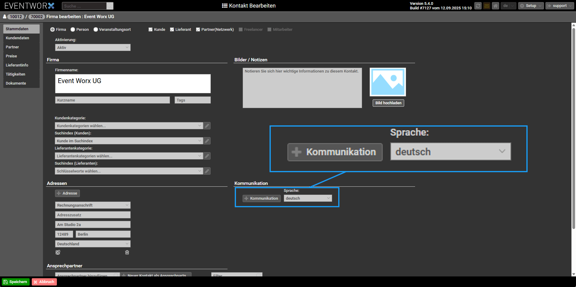 Falls ein Ansprechpartner hinterlegt ist, gilt die dort eingestellte Sprache. Diese überschreibt die Einstellung der Firma.