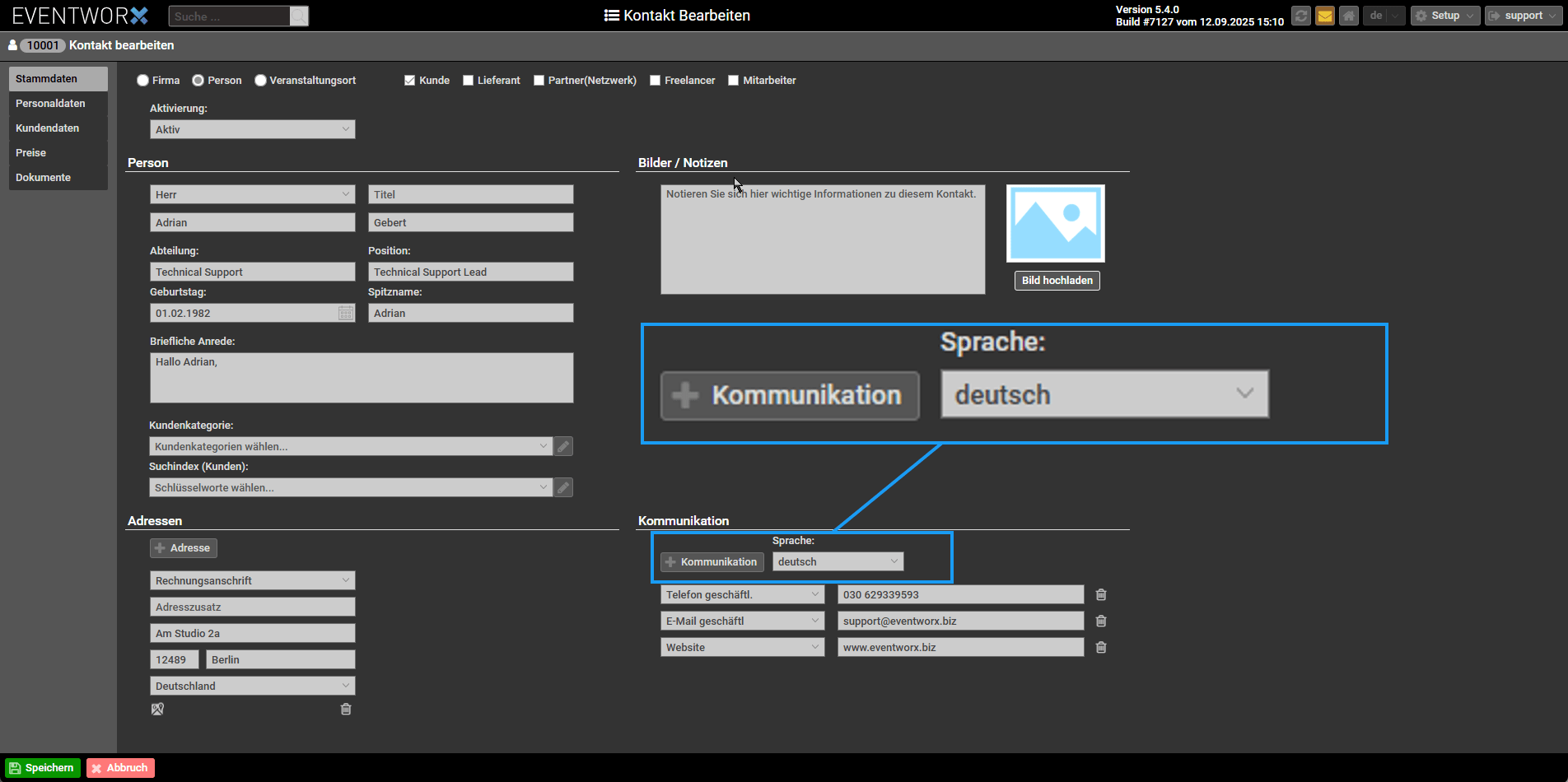 Damit Eventworx die passenden Artikeltexte automatisch auswählt, musst du bei den Kunden die Sprache hinterlegen. Es gibt zwei Stellen, an denen du die Sprache einstellen kannst: