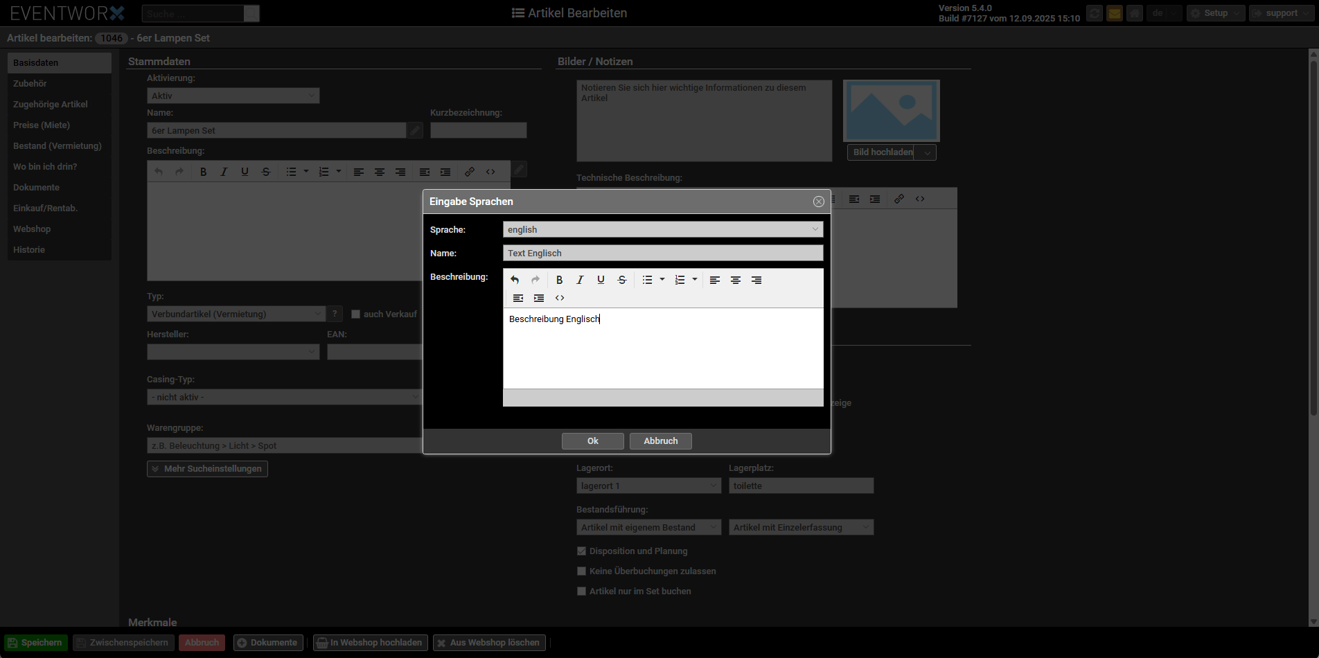 - Trage den Artikelnamen und die Beschreibung in der gewählten Sprache ein.