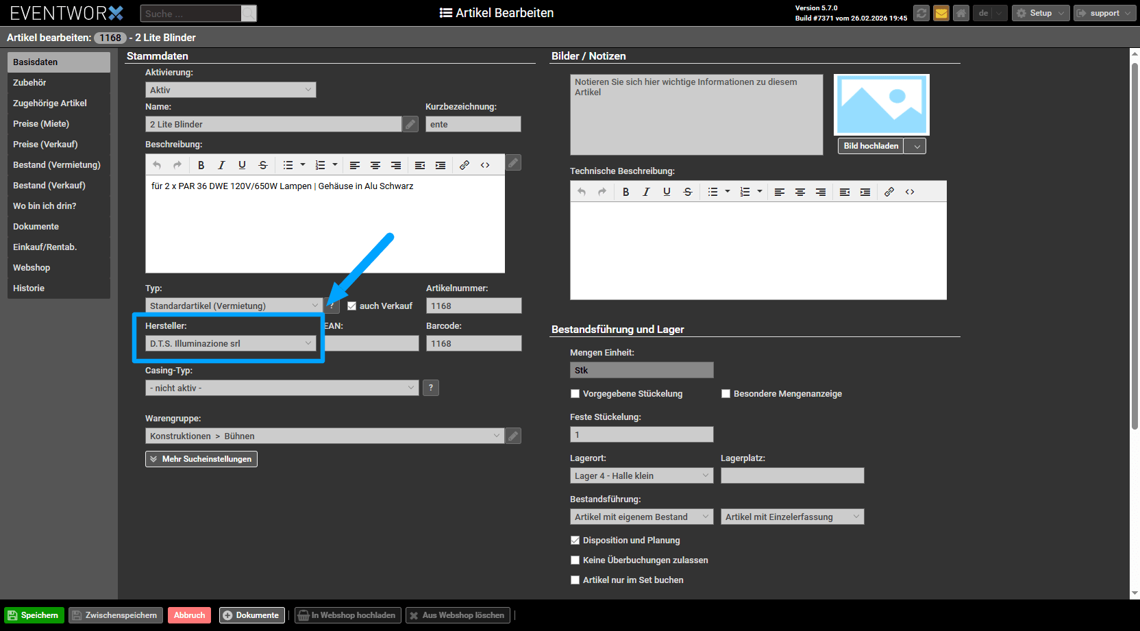 So behältst du eine saubere Datenstruktur und kannst Herstellerinformationen bei Artikeln schnell und einheitlich zuordnen. In den Artikelstammdaten wird der Hersteller dann einfach über ein Dropdown ausgewählt.