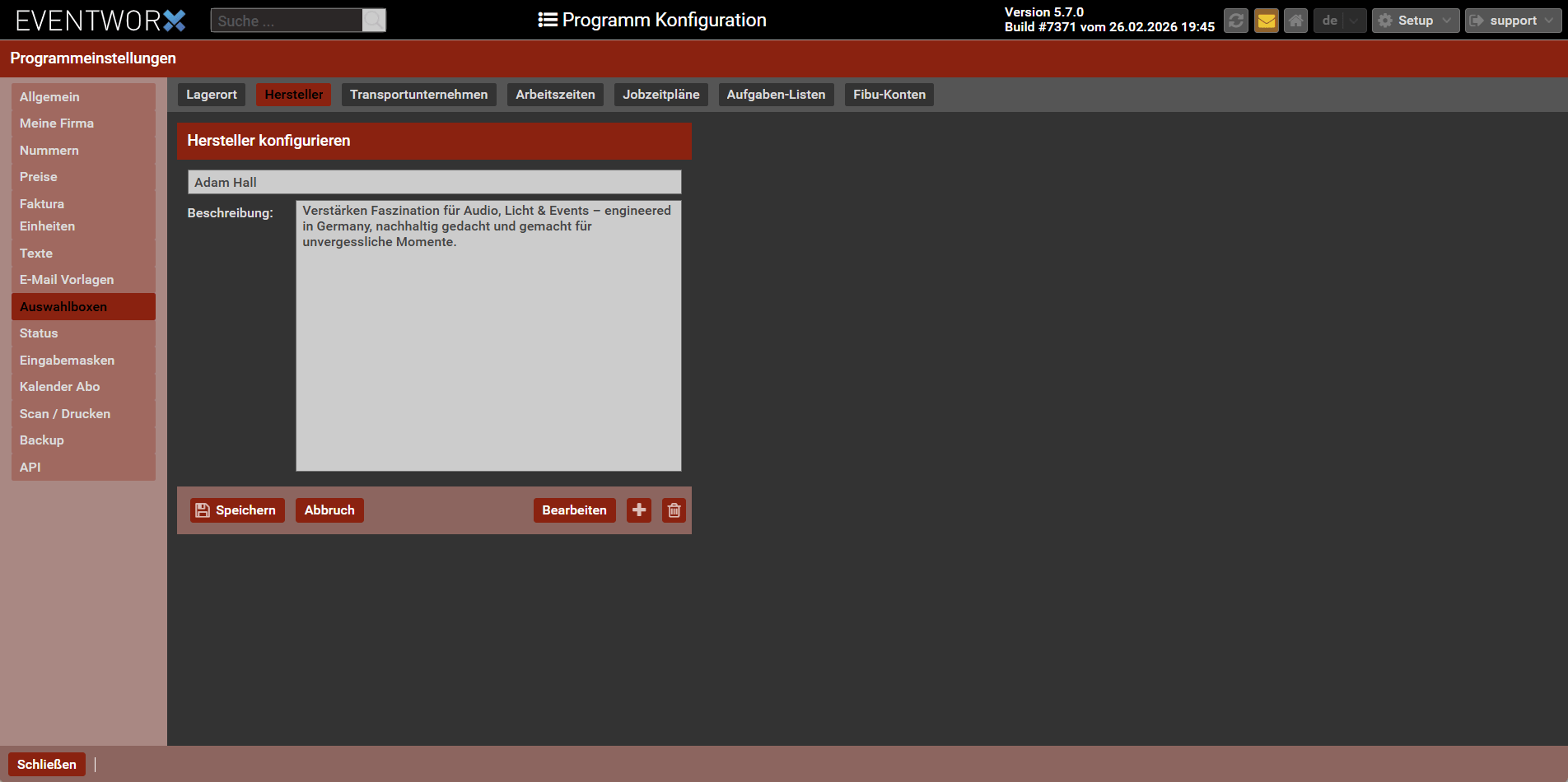 Damit du bei Artikeln nicht jedes Mal den Hersteller neu eintippen musst, kannst du deine Hersteller zentral in den Programmeinstellungen hinterlegen. Diese stehen dir anschließend bequem als Auswahl in den Artikel-Stammdaten zur Verfügung.