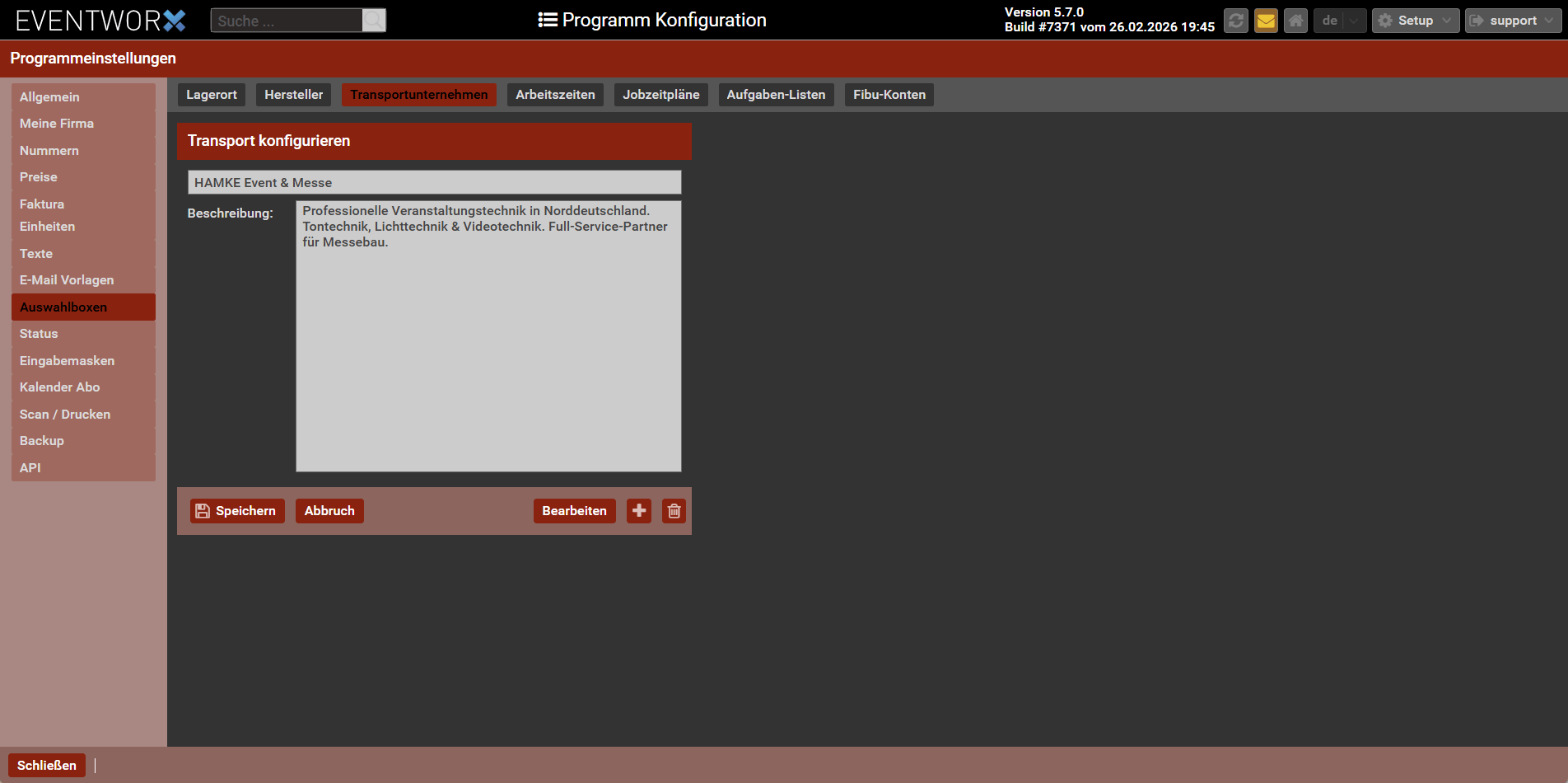 Damit du bei Lieferungen nicht jedes Mal den Transportdienstleister neu eintippen musst, kannst du deine Transportunternehmen direkt in den Programmeinstellungen hinterlegen. So stehen dir deine Logistikpartner später bequem als Auswahl zur Verfügung, zum Beispiel bei Lieferungen oder Abholungen im Job.