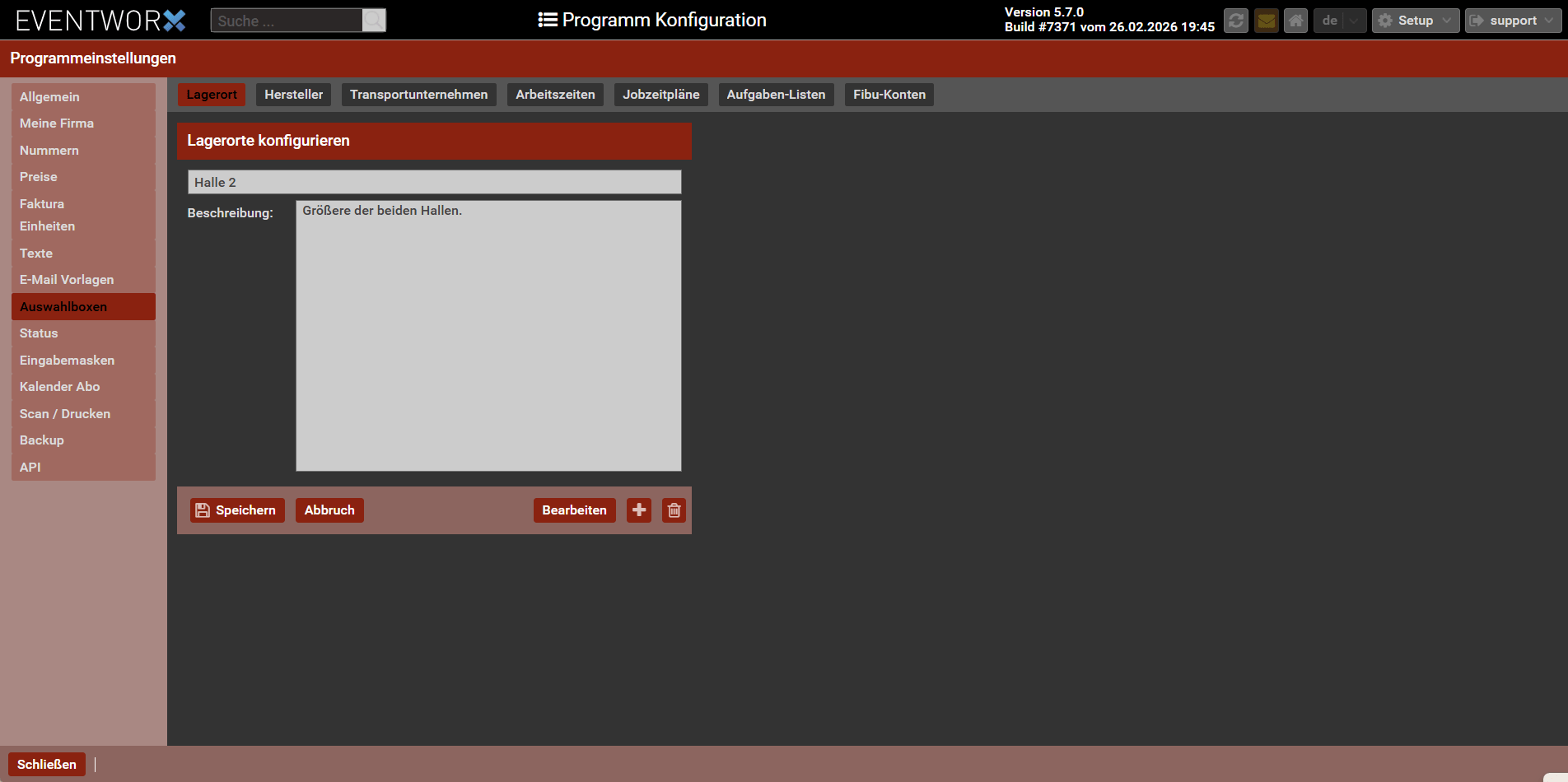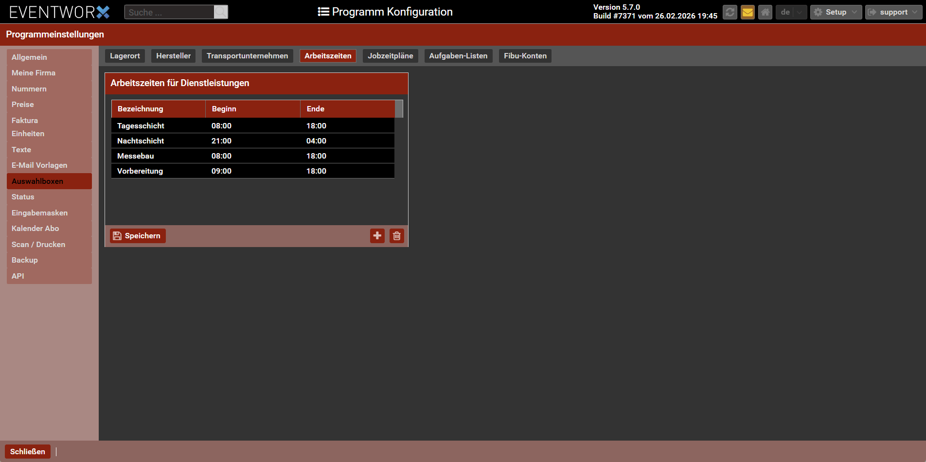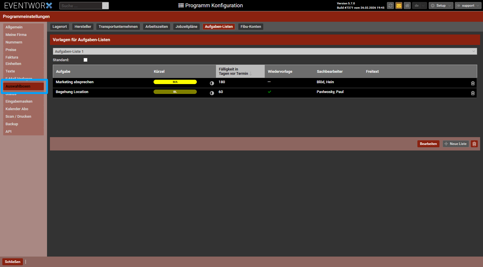 In den Programmeinstellungen von Eventworx kannst du zentrale Auswahlboxen konfigurieren. Das sind die Dropdown-Listen, die dir später in Projekten, Artikeln, Jobs und in der Buchhaltung zur Verfügung stehen. Durch ein gepflegtes Stammdaten-Setup sparst du Zeit, vermeidest Tippfehler und sorgst für saubere, konsistente Daten im System.