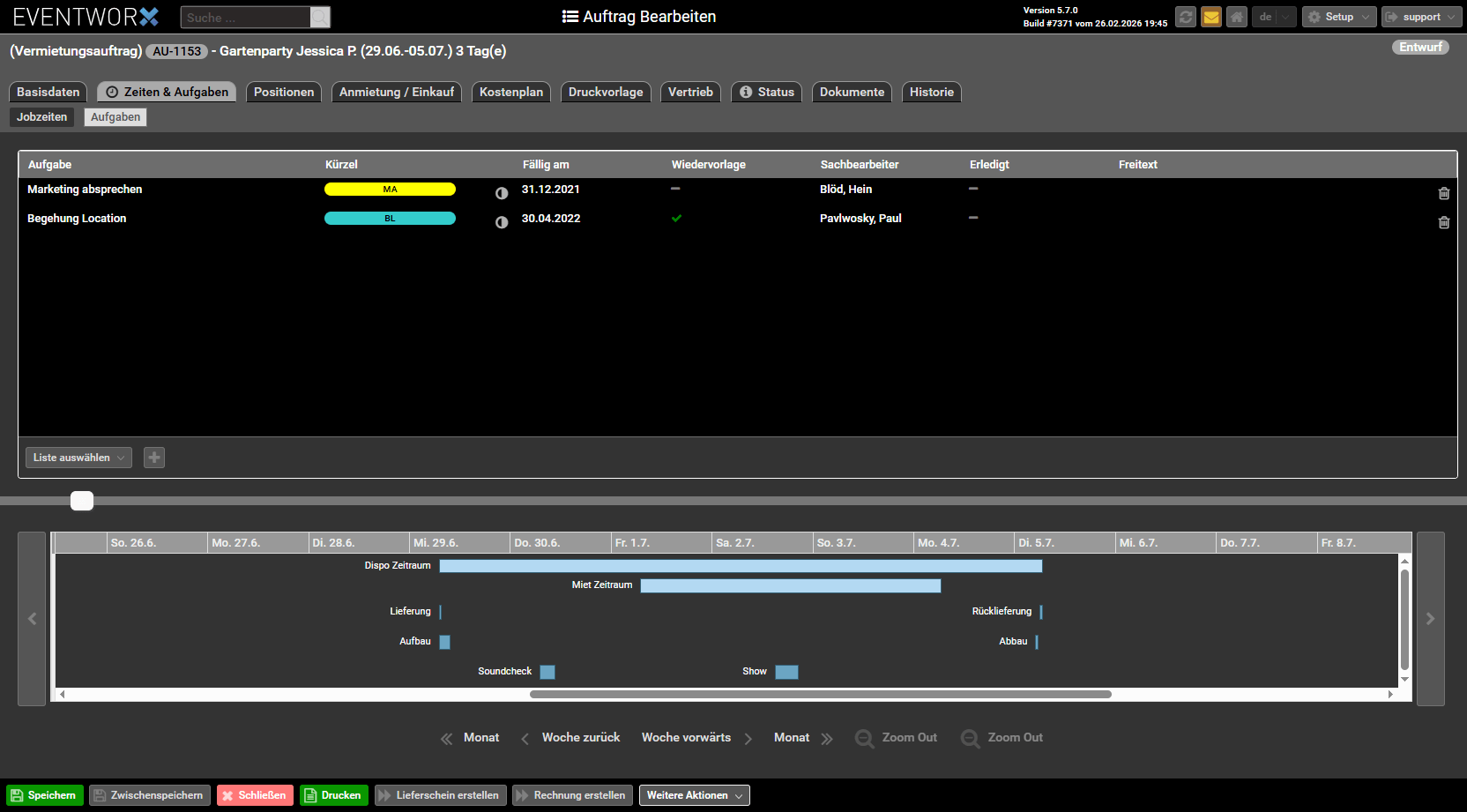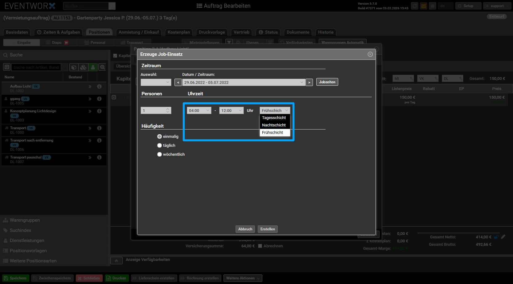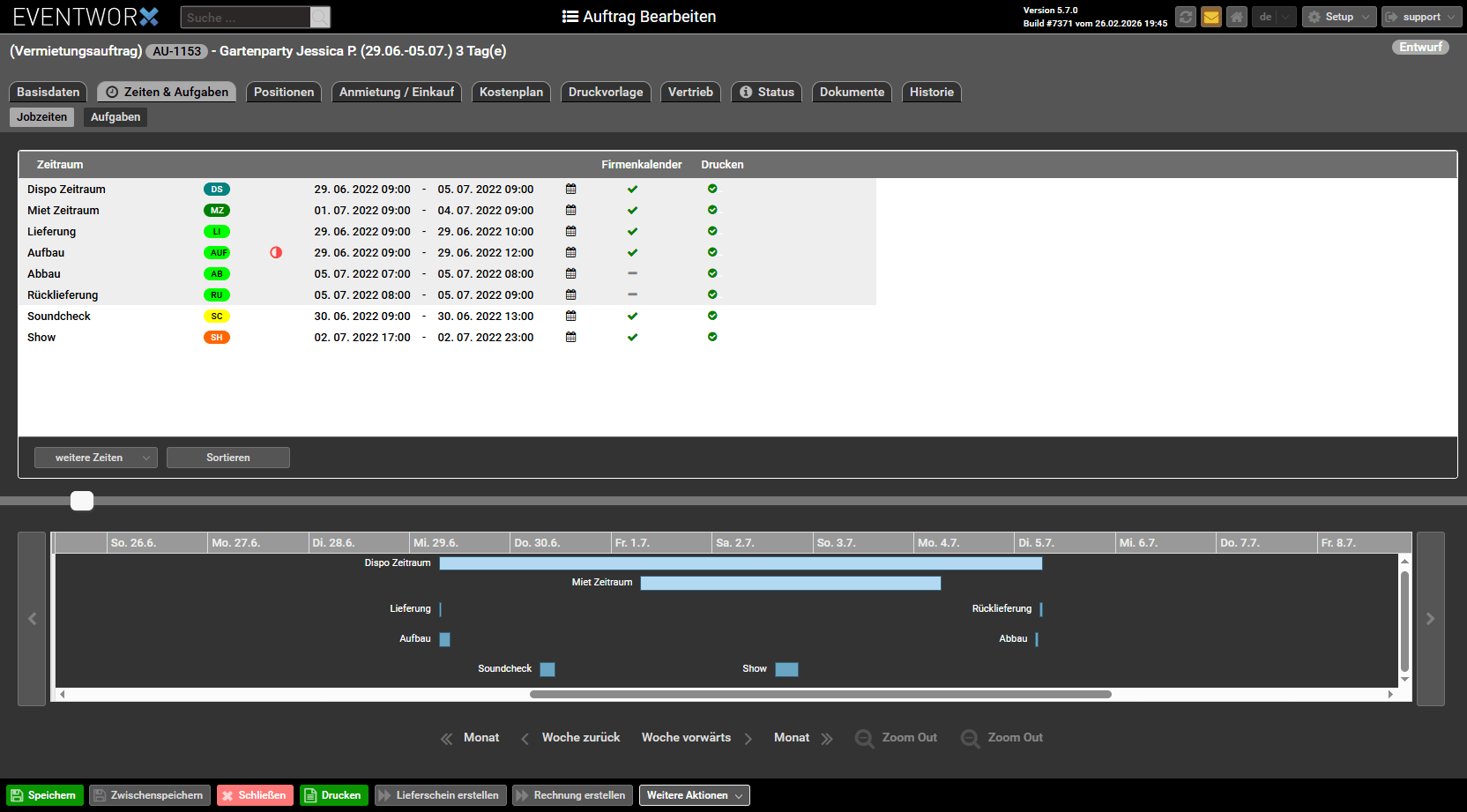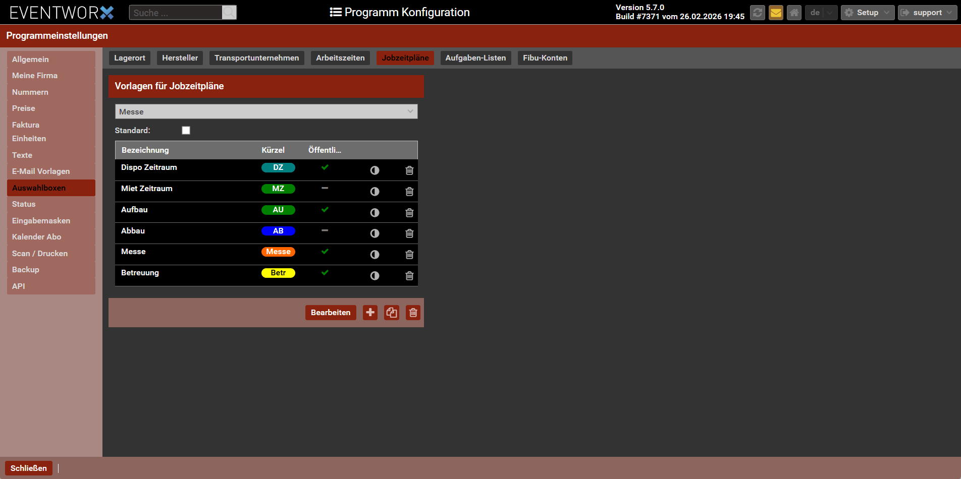 Mit Jobzeitplänen legst du fest, welche Zeitabschnitte innerhalb eines Projekts oder Jobs dargestellt werden sollen. Dadurch kannst du typische Abläufe deiner Veranstaltungen oder Produktionen einmal definieren und später immer wieder verwenden.