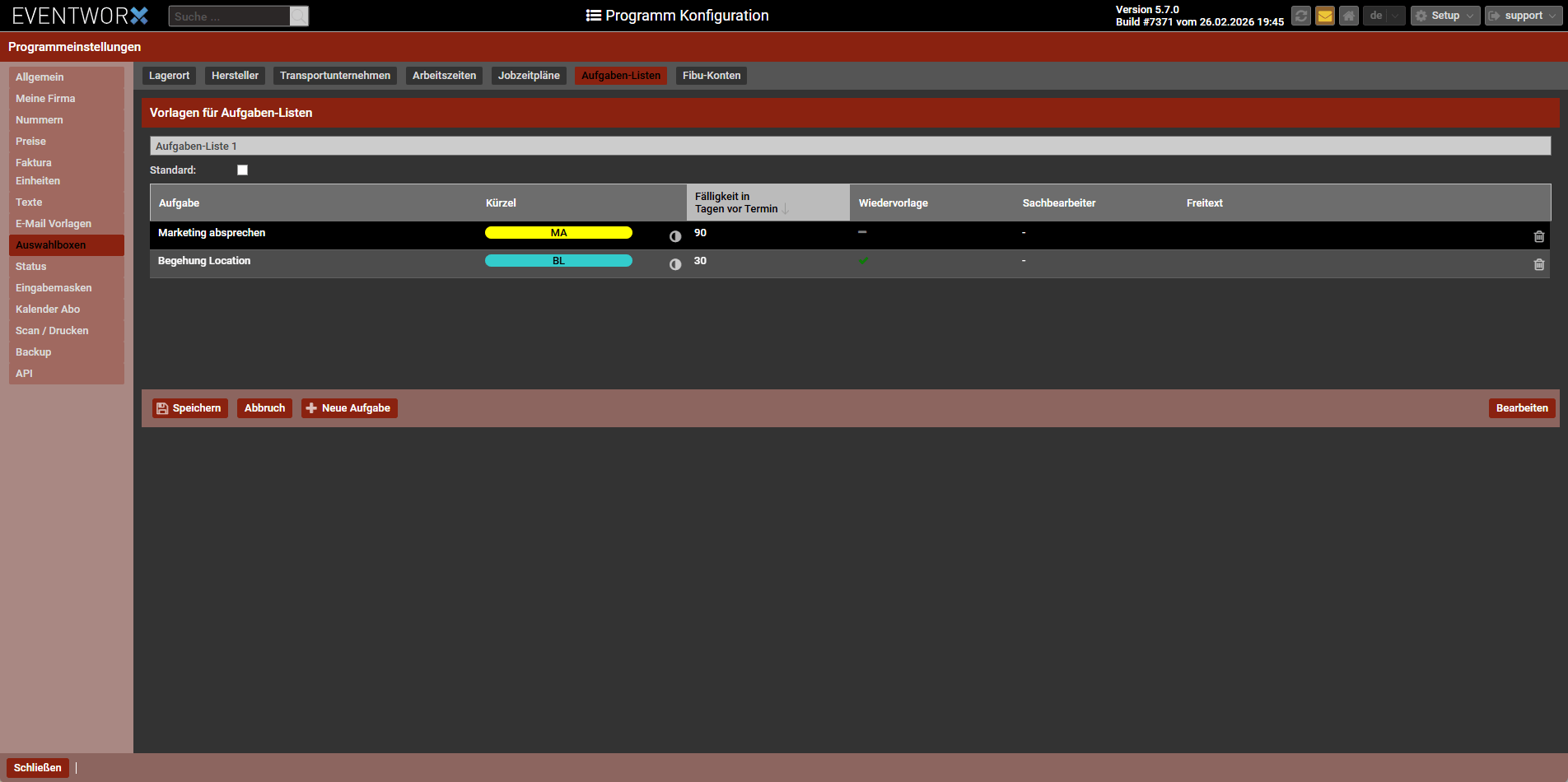 Mit Aufgaben Listen kannst du wiederkehrende Abläufe in eventworx einmal sauber vorbereiten und später in Projekten immer wieder verwenden. So musst du typische Aufgaben nicht jedes Mal neu anlegen und stellst sicher, dass wichtige Schritte nicht vergessen werden.