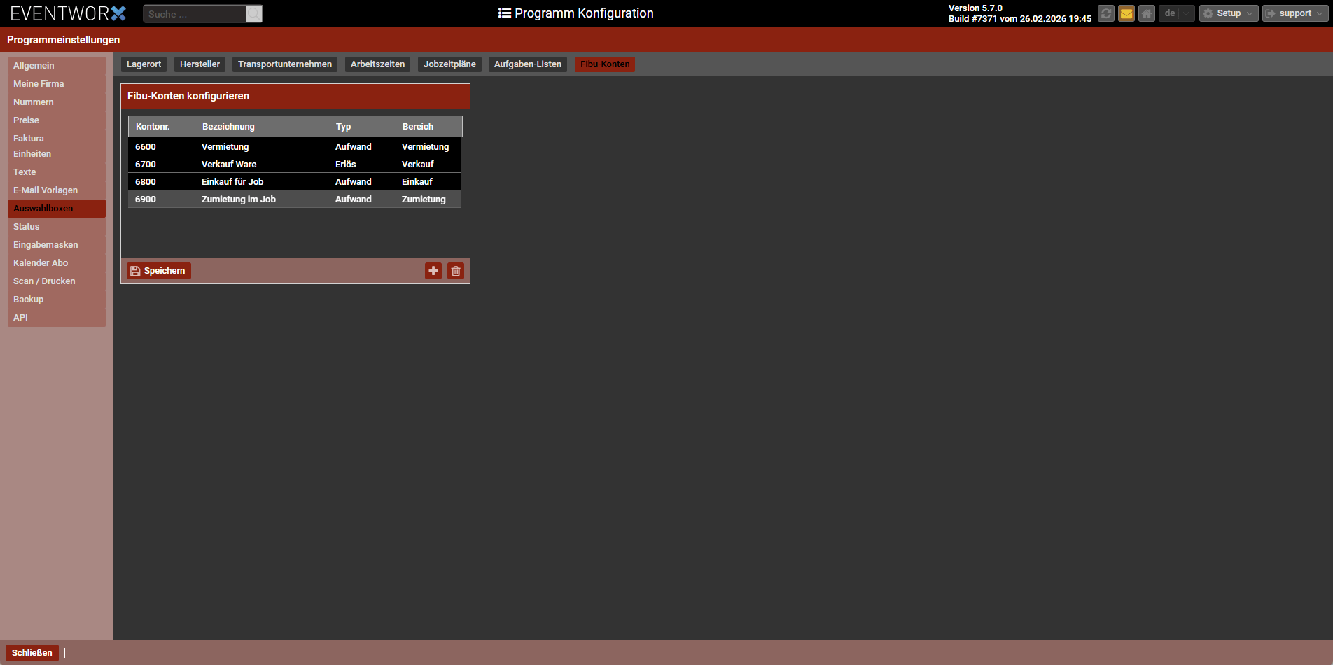 Durch die Hinterlegung dieser Konten weiß Eventworx später, welches Konto bei der Auswertung oder beim Export für die Buchhaltung verwendet werden soll. So können Umsätze und Kosten aus deinen Jobs automatisch den richtigen Bereichen zugeordnet werden, zum Beispiel bei Auswertungen oder beim Export an deine Finanzbuchhaltung.
