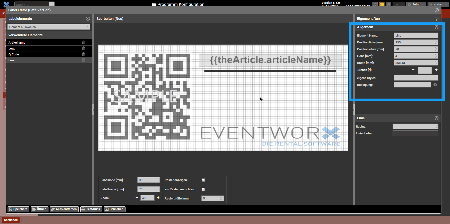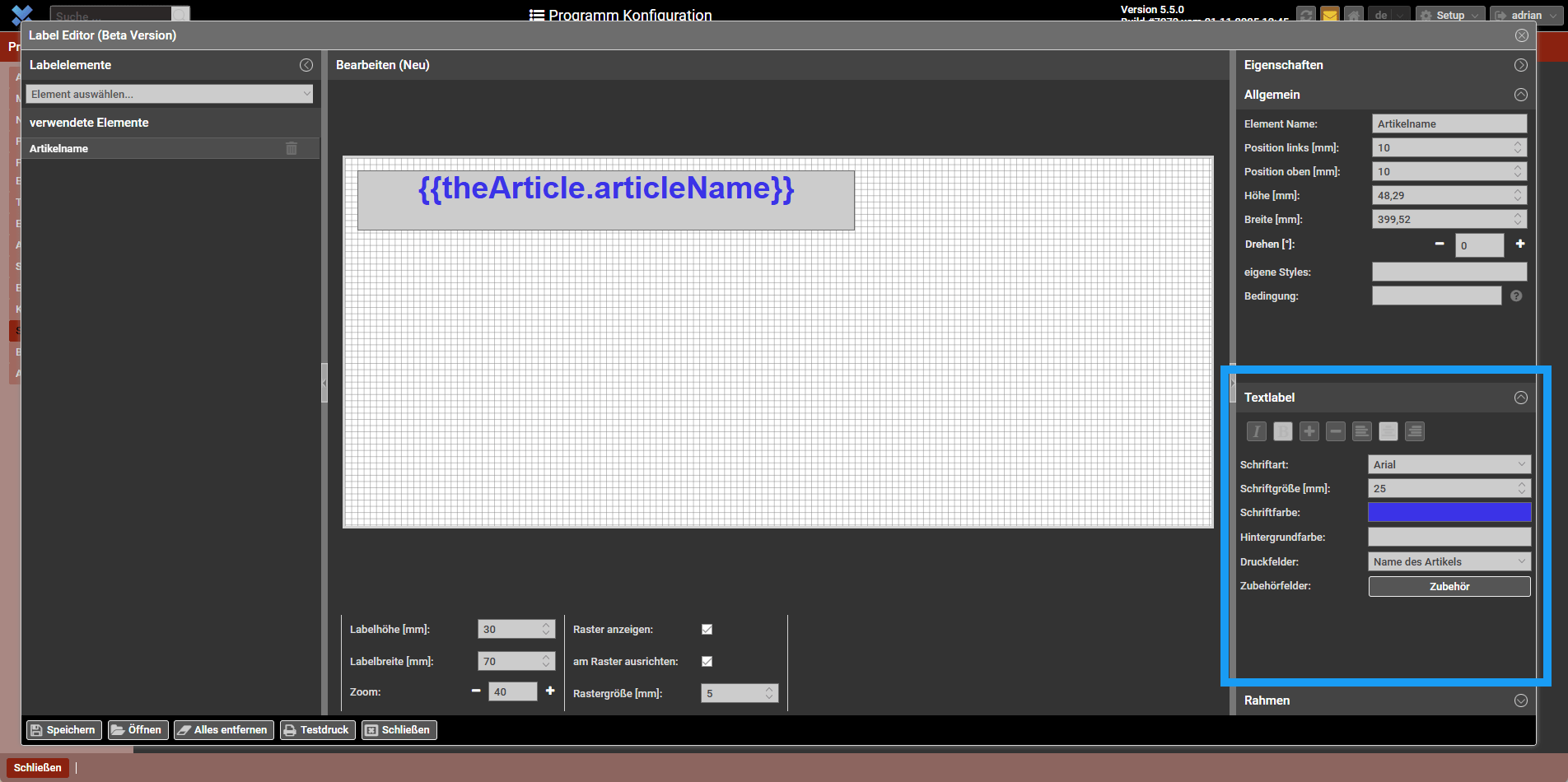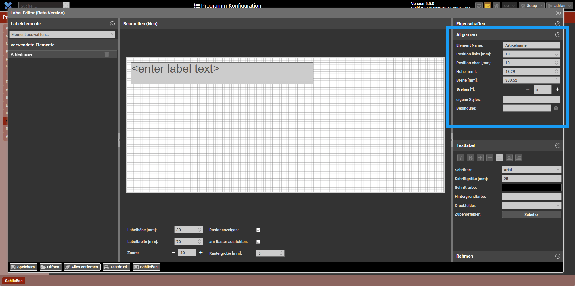 Das Textlabel ist eines der wichtigsten Elemente, weil es die Verbindung zwischen dem Etikettenlayout und den echten Daten aus deinem Artikelbestand herstellt. Du findest es in der Elementliste und kannst es einfach in die Arbeitsfläche hinzufügen.