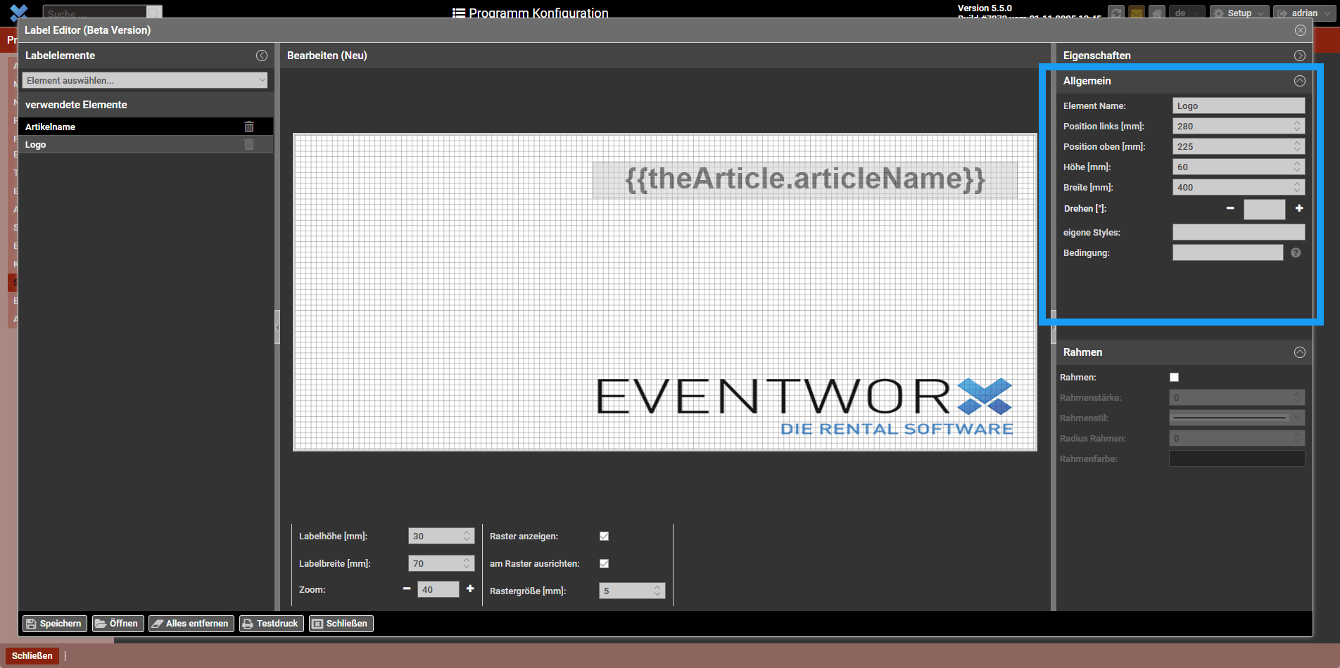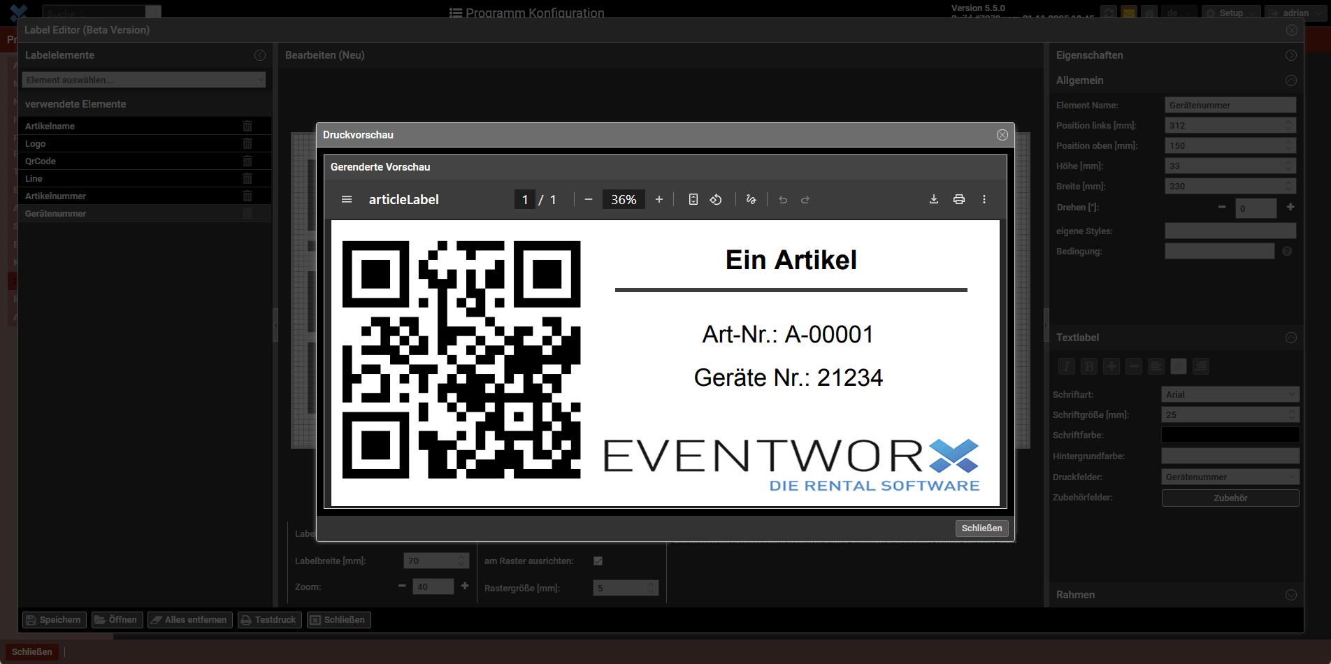 Sobald dein Layout fertig ist, gehts du auf speichern und gibst ihm einen klaren Namen. Zum Abschluss solltest du mit dem Testdruck das Etikett testen. In der Vorschau kannst du überprüfen, ob alle Felder korrekt platziert sind, Abstände stimmen und Barcodes gut lesbar sind.