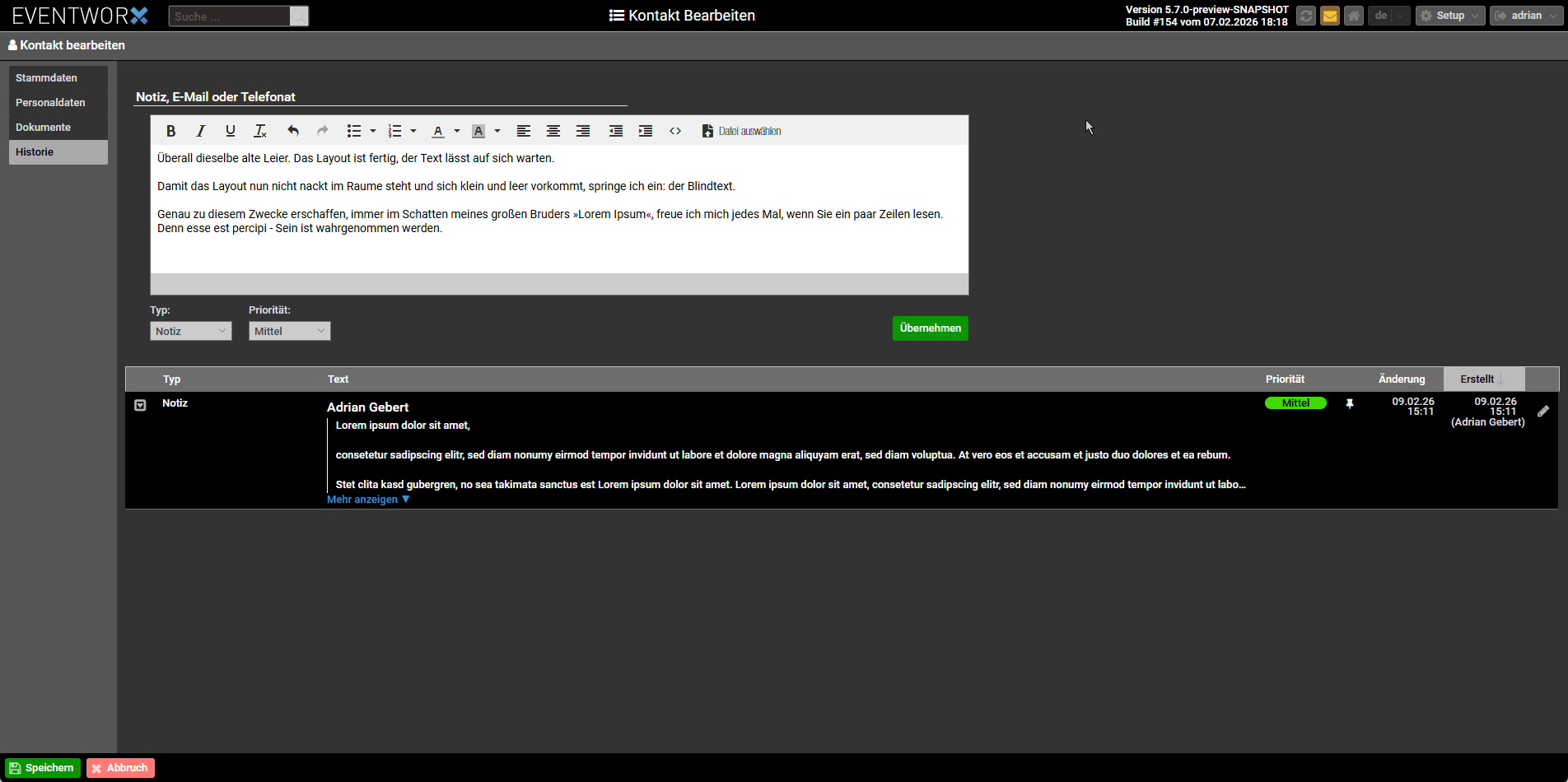 Die Bearbeitung ist ausschließlich im Reiter Historie innerhalb der Kontakt Stammdaten möglich.