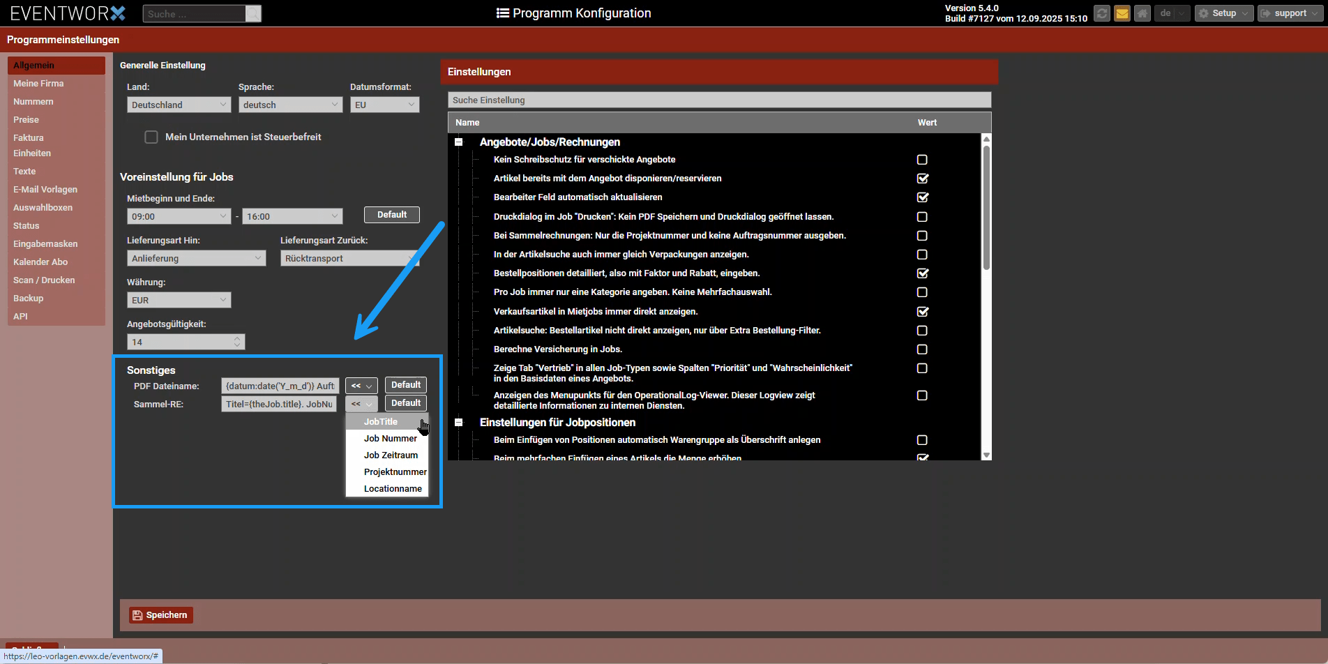Direkt darüber kannst du auch die automatische Benennung des PDF-Dateiennamen für deine Sammelrechnungen steuern.