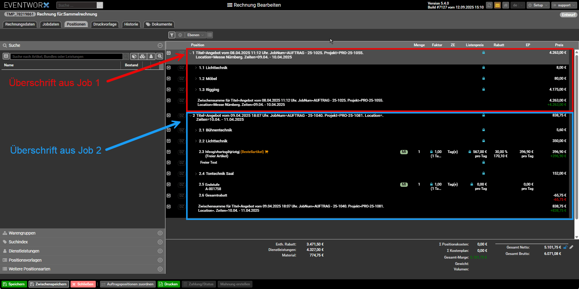Das wars auch schon, euer Entwurf für die Sammelrechnung ist fertig. Die Überschriften mit den jeweiligen Jobtitel und Projektnummern werden automatisch erzeugt. Trotzdem könnt Ihr Sie natürlich, nach eurem Bedarf, anpassen.